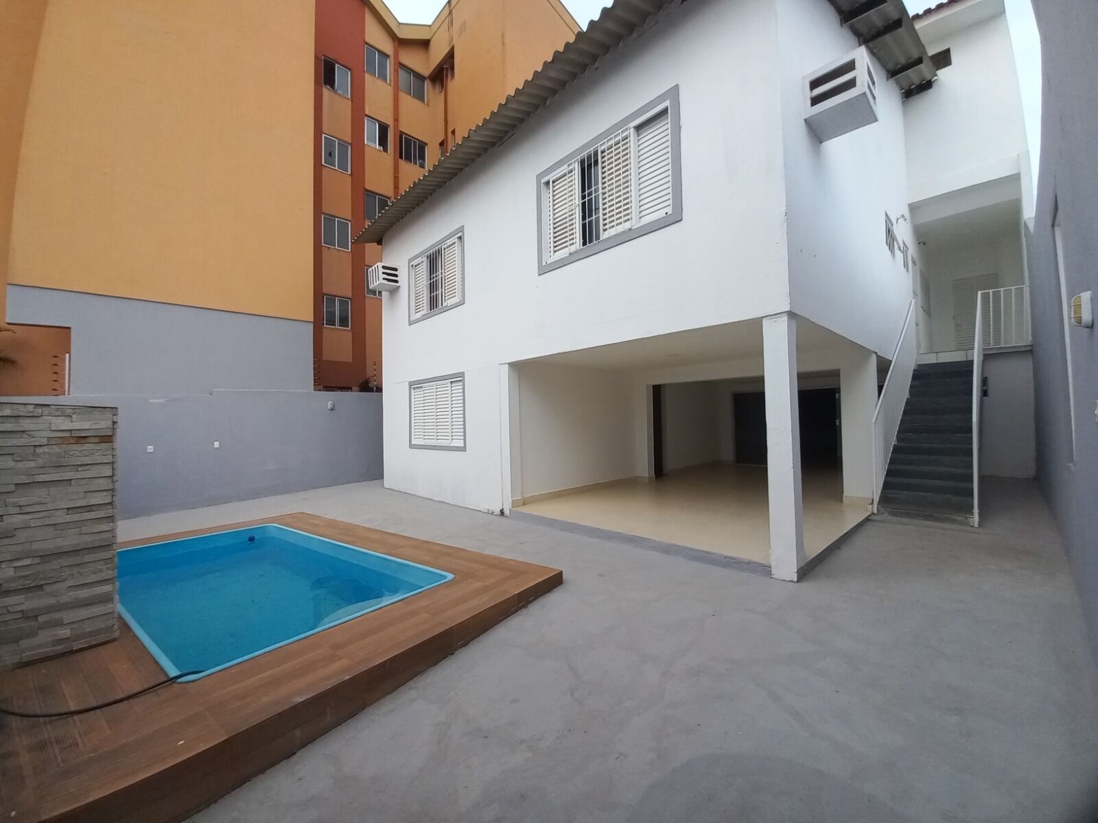ANDAR INFERIOR (SUBSOLO): SALÃO ESPAÇOSO, 3 QUARTOS, BANHEIRO SOCIAL, PISCINA COM CASCATA, ILUMINAÇÃO DECORATIVA E CHURRASQUEIRA